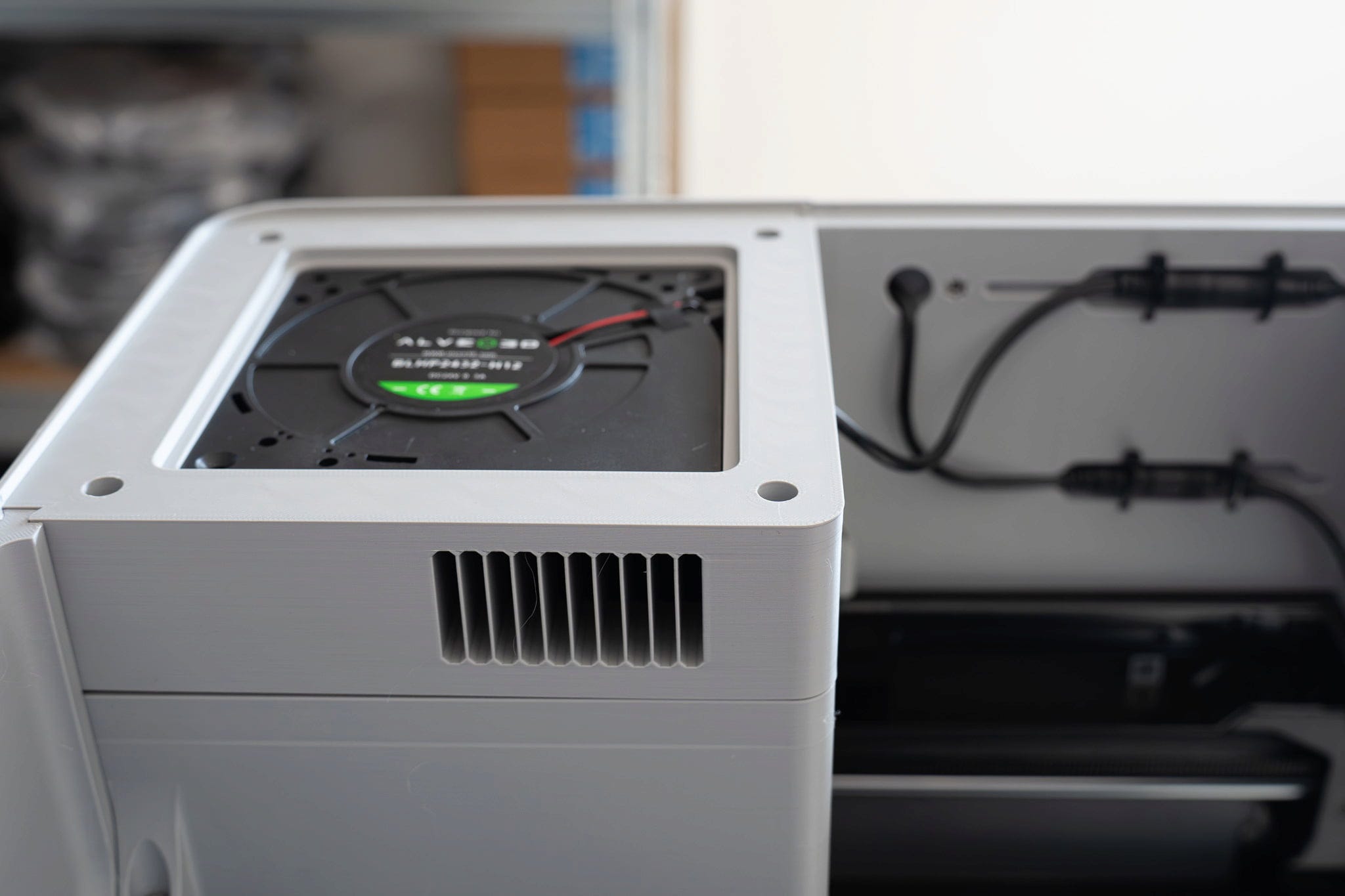 É utilizado a ventoinha BLHP2432_H10, que foi especificamente selecionada para garantir um funcionamento silencioso com uma pressão ligeiramente reduzida no espaço de instalação. Isto permite um caudal de ar controlado e contribui para condições de pressão estáveis.