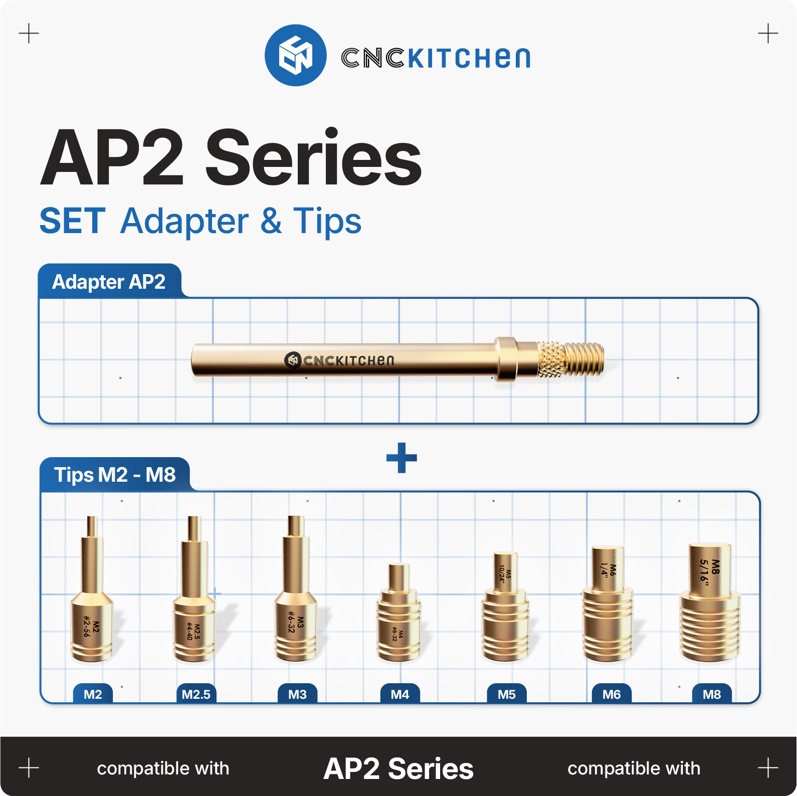 As pontas de solda são compatíveis com os ferros de solda padrão AP2 e combinam perfeitamente com os insertos roscados CNC Kitchen. Têm marcações a laser e entalhes para facilitar a etiquetagem do tamanho. Em conformidade com o REACH.