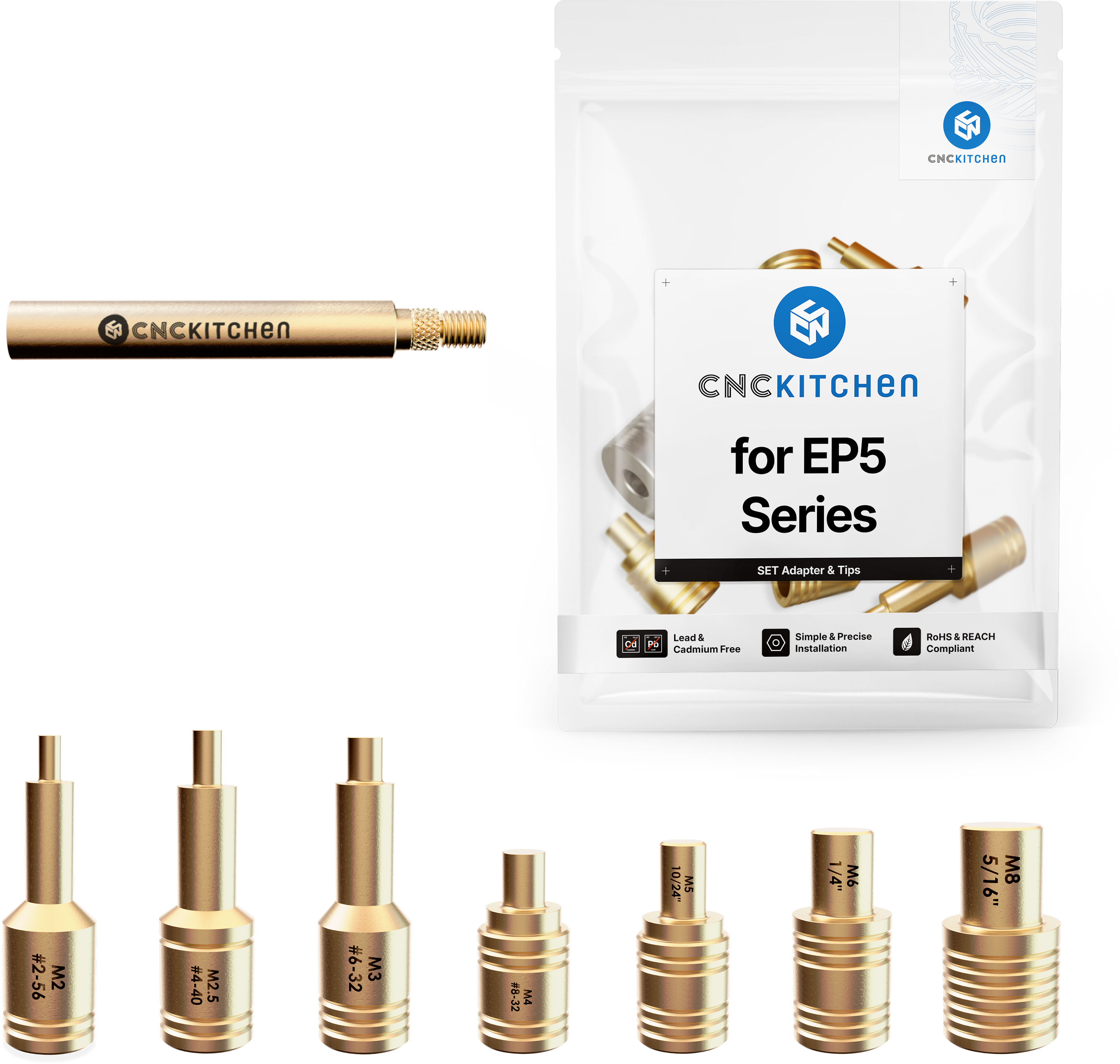 As pontas de solda são compatíveis com os ferros de solda padrão EP5 e combinam perfeitamente com os insertos roscados CNC Kitchen. Têm marcações a laser e entalhes para uma fácil etiquetagem de tamanhos. Em conformidade com o REACH.