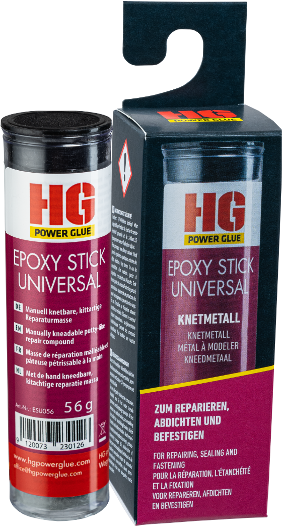 O HG Power Glue Epoxy Stick é uma massa de reparação versátil que te permite vedar, reparar e fixar uma grande variedade de materiais. Após uma breve amassadura, forma-se uma massa homogénea e moldável, fácil de trabalhar e que endurece em poucos minutos.