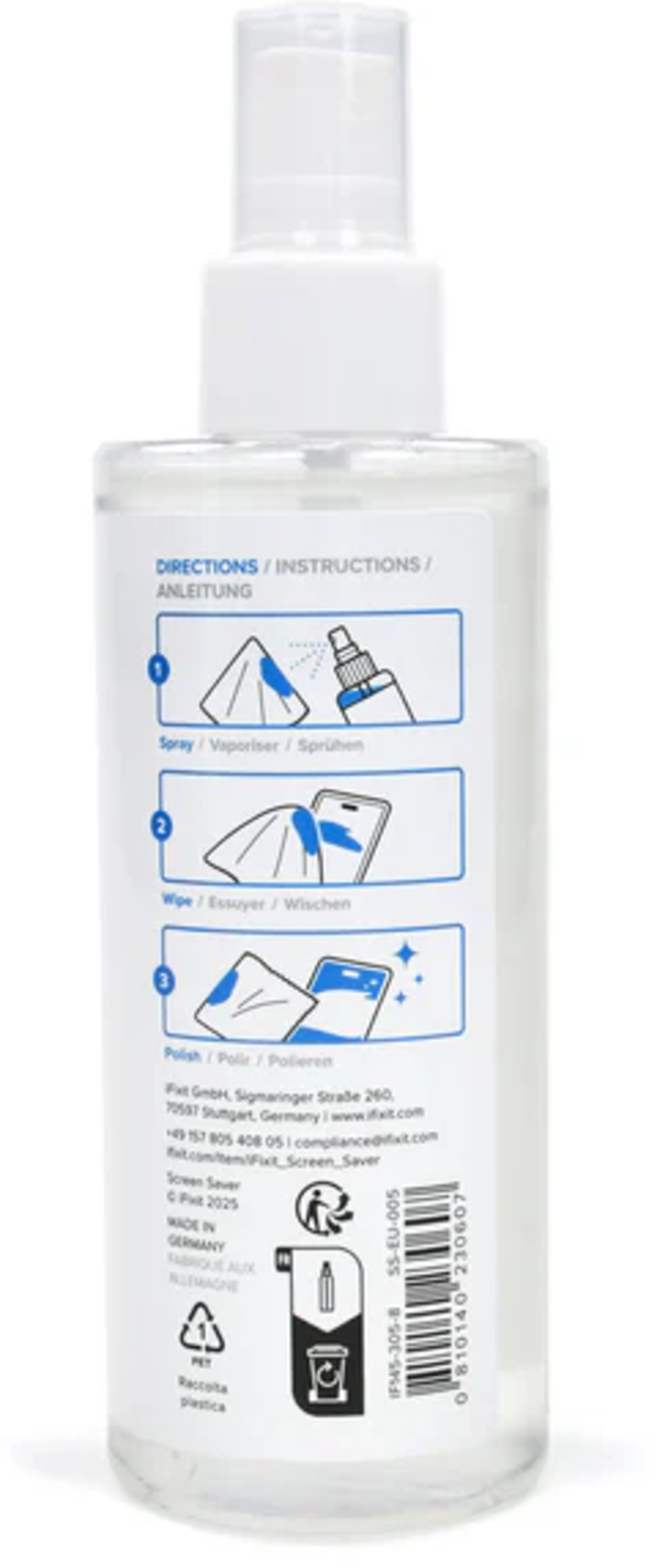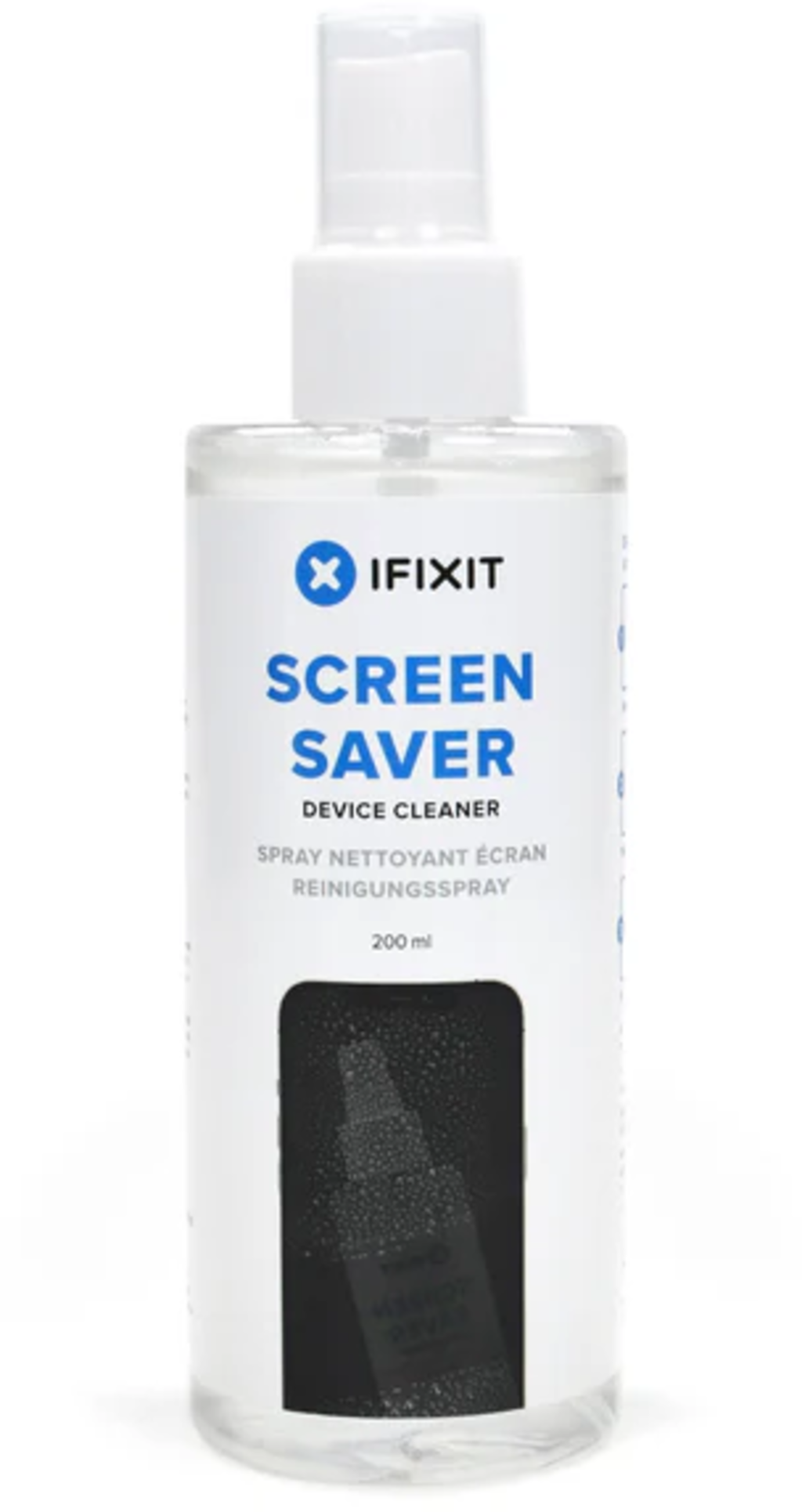 Este delicado spray de limpeza iFixit Screen Saver foi desenvolvido especialmente para o cuidado de ecrãs, caixas de plástico e outras superfícies sensíveis. A fórmula suave remove de forma eficaz o pó, impressões digitais e sujidade ligeira, sem deixar resíduos nem agredir os materiais.