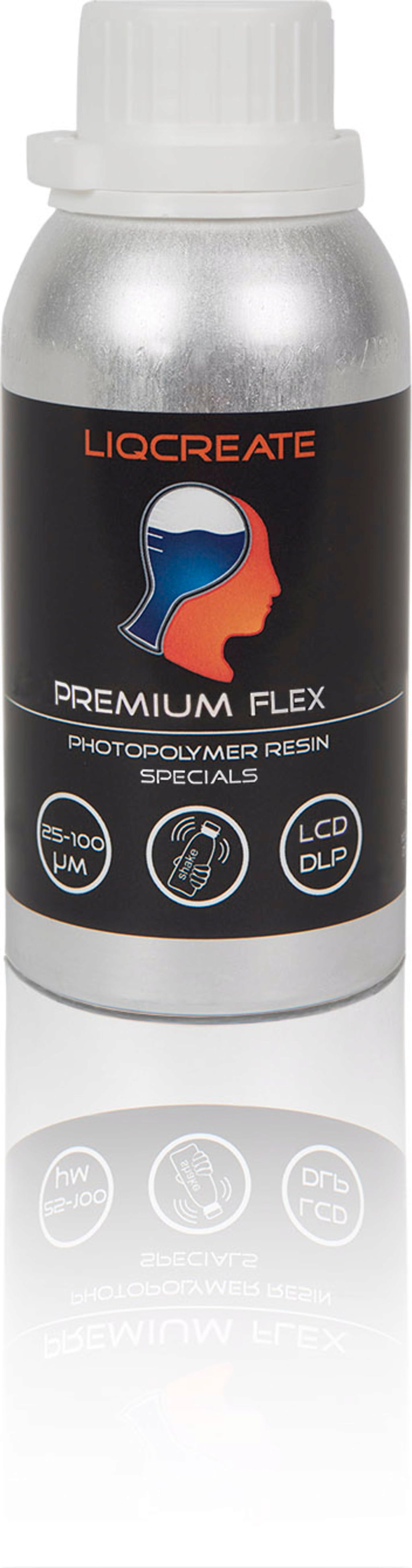 Liqcreate Premium Flex é um fotopolímero azul-turquesa translúcido com excelente processabilidade e velocidade de impressão em impressoras 3D baseadas em MSLA e DLP.