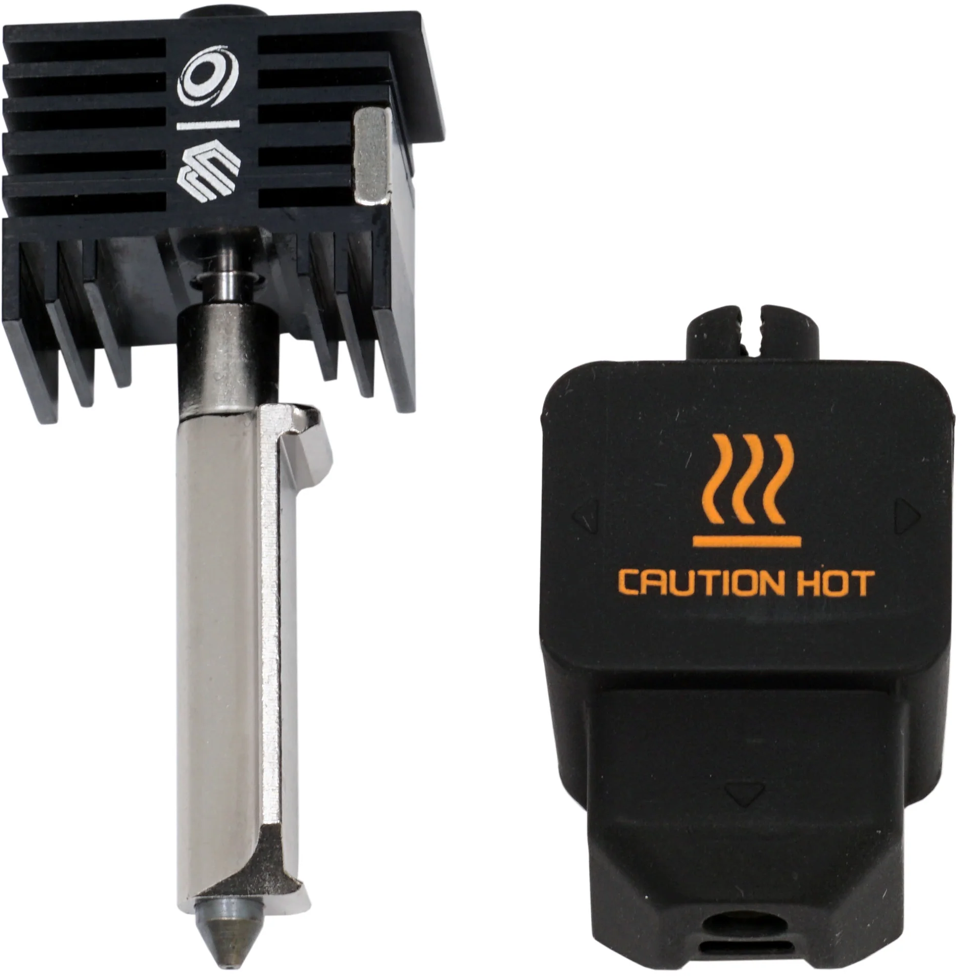 A ponta do bico é feita de aço rápido endurecido M2, tratado termicamente para atingir uma dureza extrema de 68 HRC. É refinada com um revestimento de dissulfureto de tungsténio, que atua como camada antiaderente: os resíduos de plástico não se agarram, a qualidade de impressão torna-se mais limpa e o hotend funciona de forma fiável durante mais tempo!