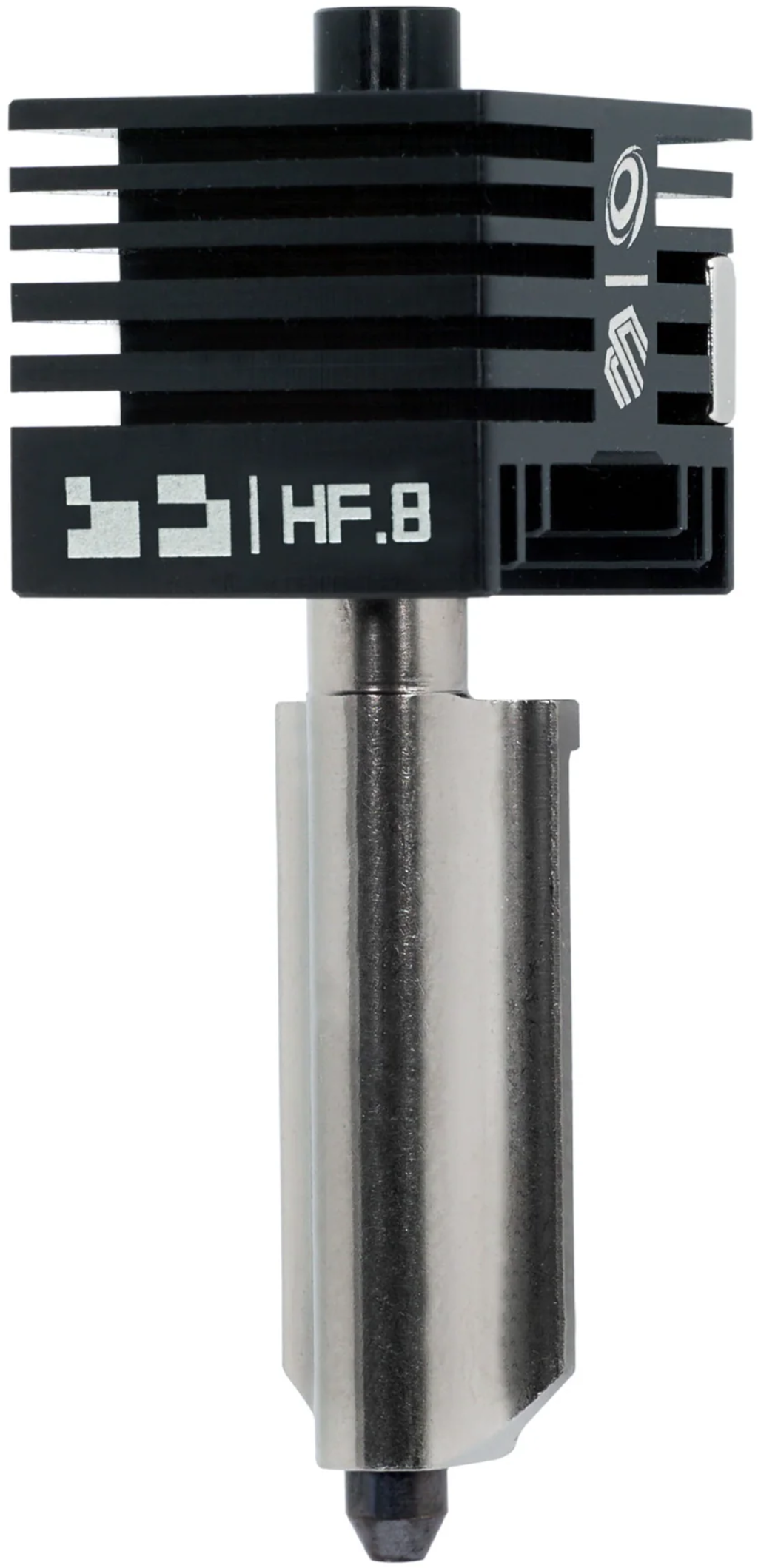 A ponta do bico é feita de aço rápido endurecido M2, tratado termicamente para atingir uma dureza extrema de 68 HRC. É refinada com um revestimento de dissulfureto de tungsténio, que atua como camada antiaderente: os resíduos de plástico não se agarram, a qualidade de impressão torna-se mais limpa e o hotend funciona de forma fiável durante mais tempo!