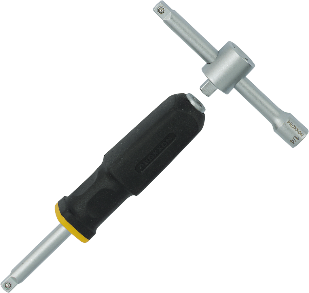 O elemento central do conjunto é o roquete de 1/4", forjado e endurecido a partir de uma única peça de aço CrV. A engrenagem precisa com 52 dentes garante que vários dentes engrenem simultaneamente, permitindo a transmissão segura de binário muito elevado. Um mecanismo de libertação integrado possibilita a remoção rápida dos acessórios com o simples toque de um botão. Para proteção ideal, a superfície é duplamente niquelada e posteriormente cromada mate. O punho ergonómico em TPR resistente a óleo e ácido está firmemente fixado e inclui um orifício para suspensão.