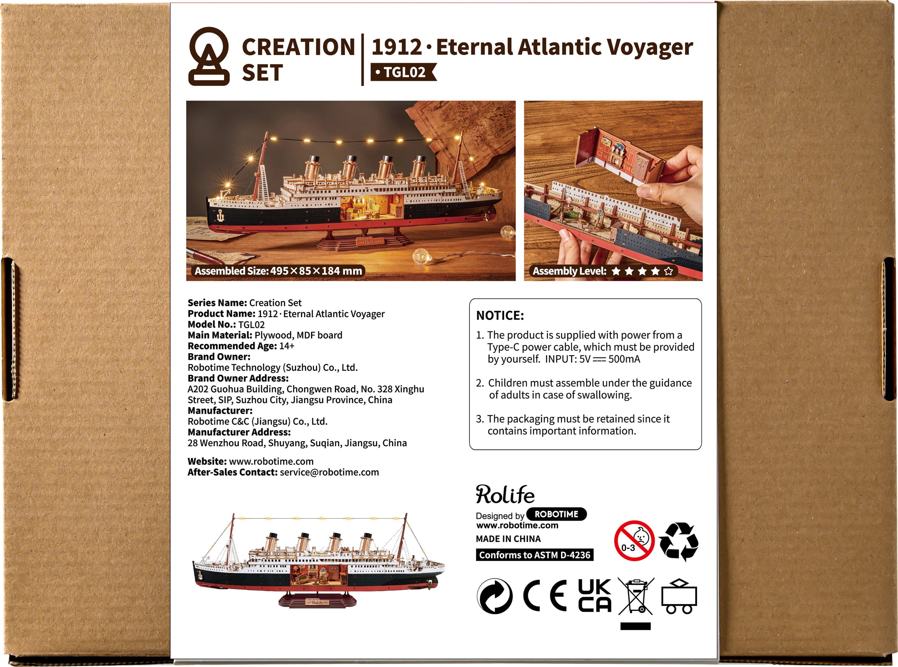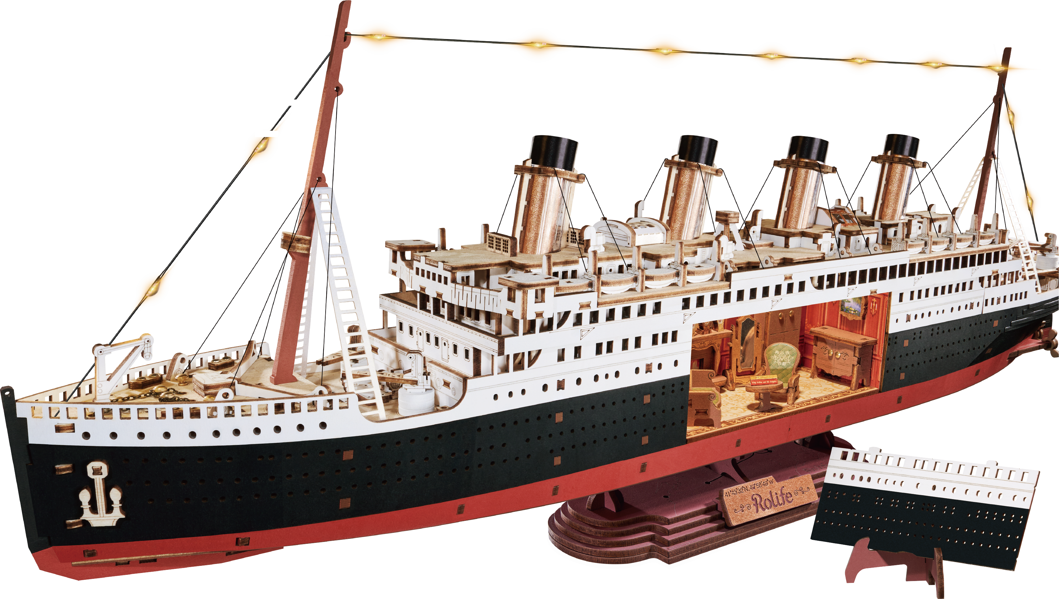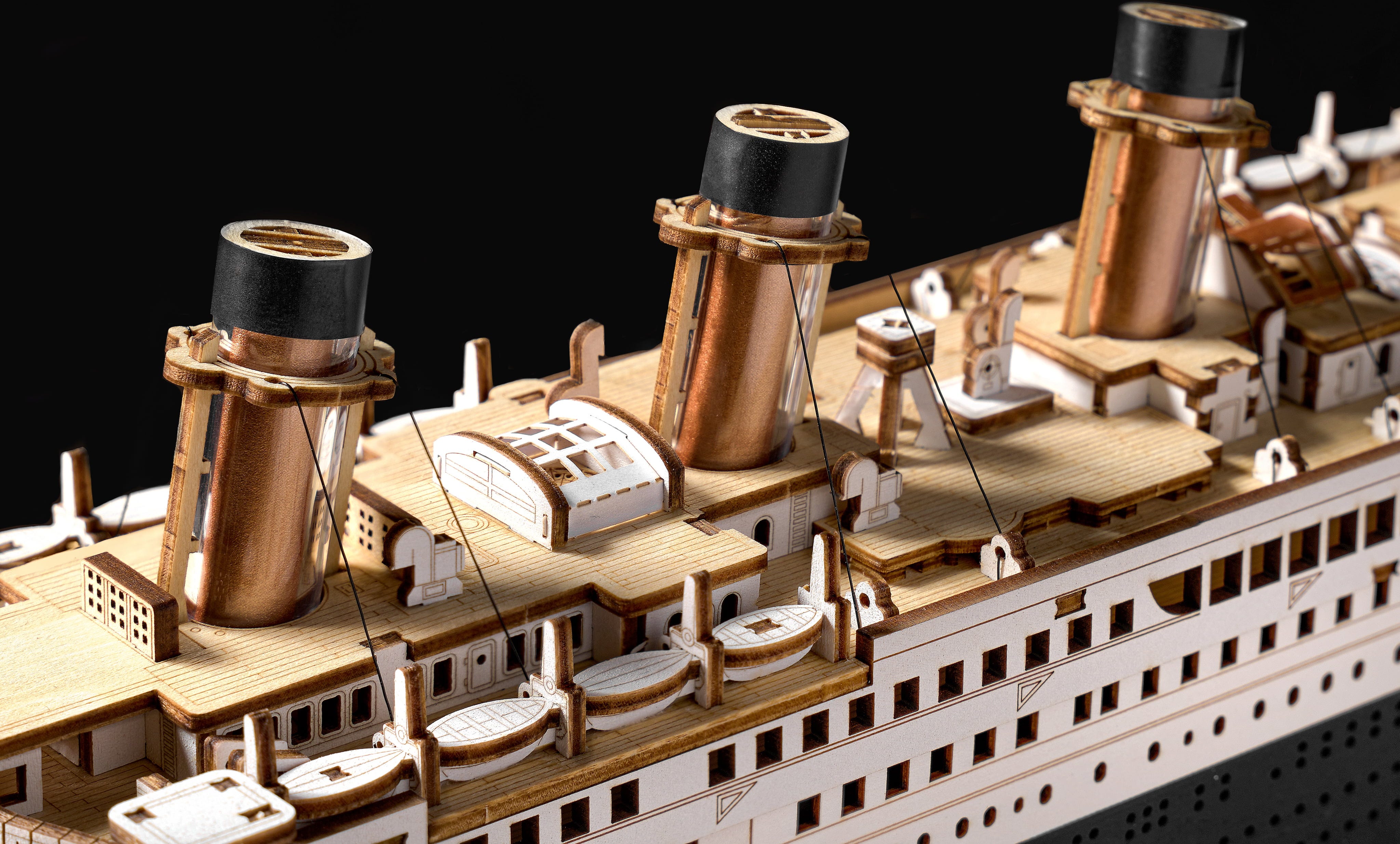 Uma viagem ao passado: logo durante a montagem, a experiência assemelha-se a uma viagem no tempo. Quatro orgulhosas chaminés elevam-se no horizonte, o clássico esquema de cores vermelho-preto-branco é complementado por elegantes apontamentos dourados. Entre os mastros brilham pequenas luzes LED, que conferem ao navio um suave fulgor noturno – quase como se estivesse prestes a traçar rumo ao horizonte.