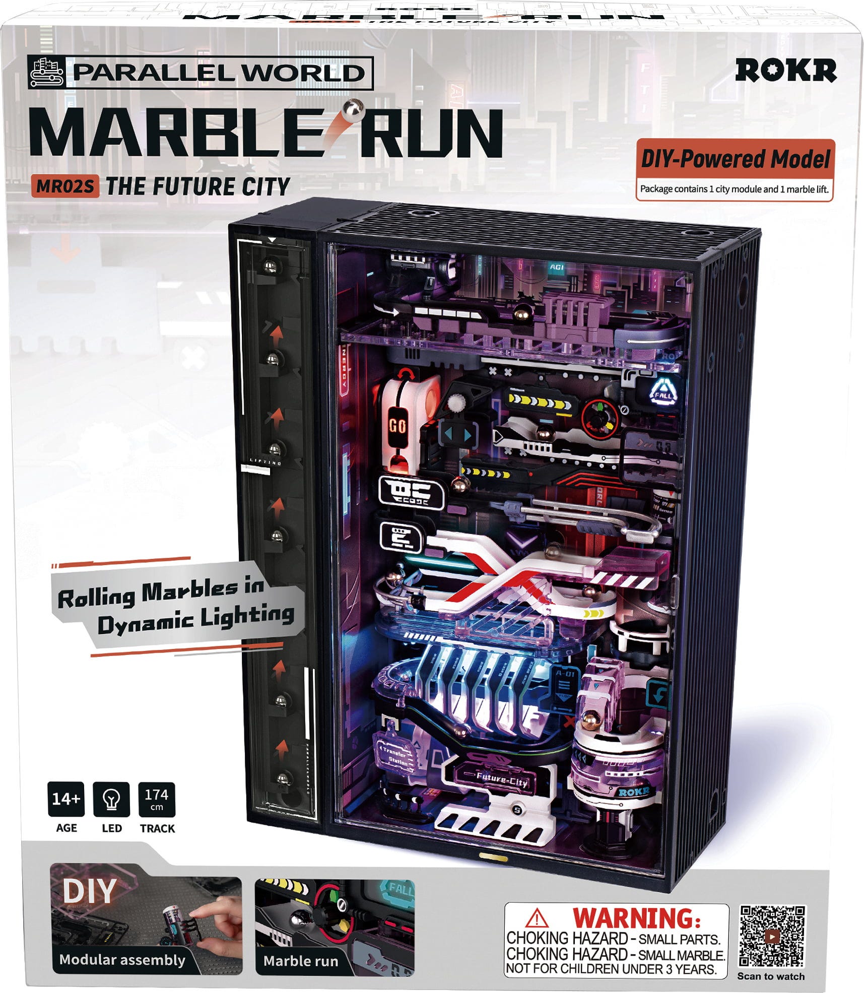 Luz néon reflete-se no aço, as máquinas sussurram e, algures, uma berlinde inicia a sua viagem. ROKR The Future City é uma pista de berlindes em estilo cyberpunk sob a forma de kit de modelismo, inspirada em videojogos e metrópoles futuristas. As pistas clássicas de berlindes foram aqui reinterpretadas e transportadas para um mundo urbano do futuro, onde movimento, luz e arquitetura se fundem.