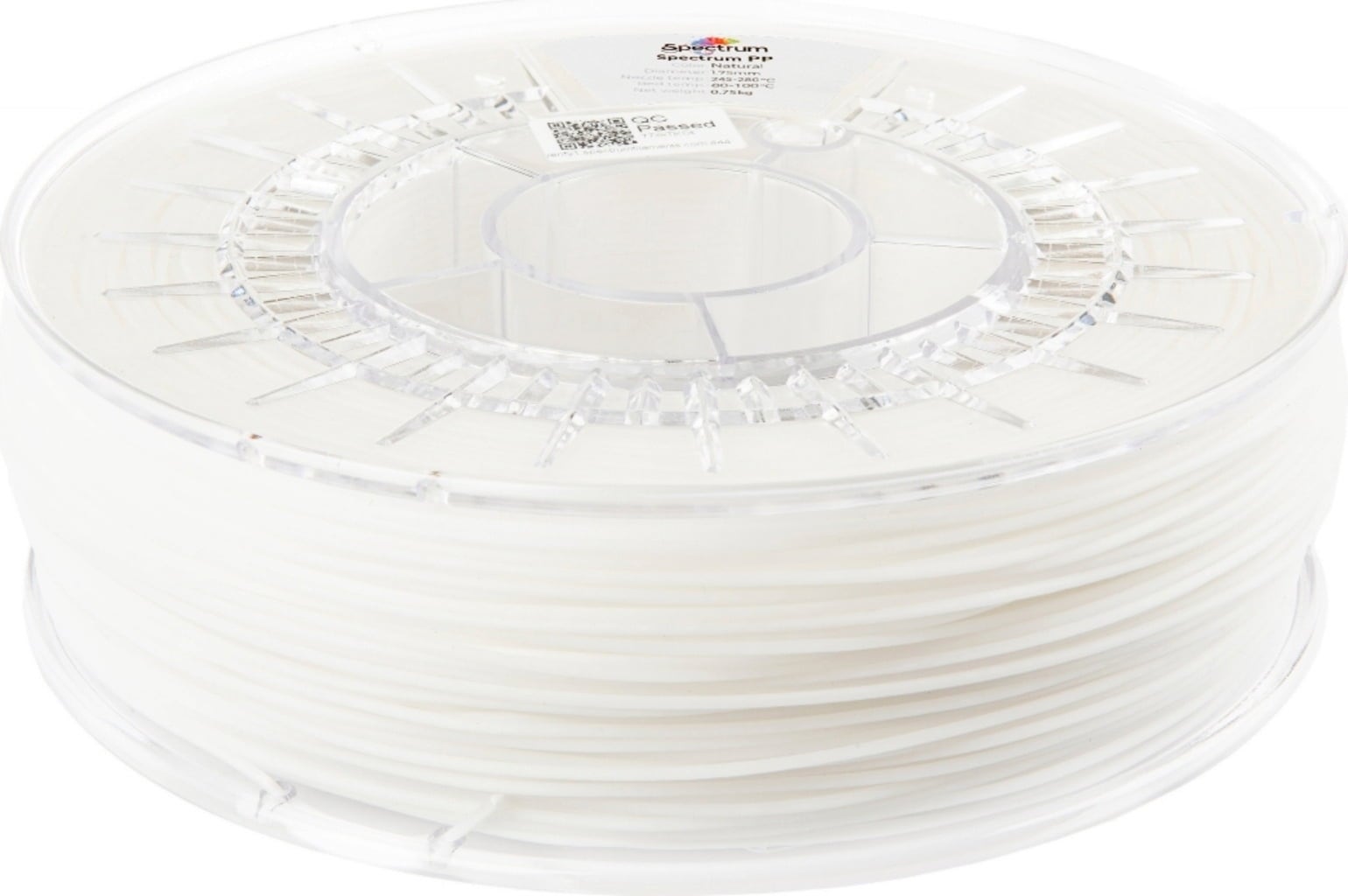 Spectrum PP é um filamento de polipropileno de alto desempenho, desenvolvido especialmente para aplicações em que são necessários baixo peso, elevada flexibilidade e excelente resistência química e mecânica. O material combina robustez estrutural com uma flexibilidade excecional e atinge alongamentos até 600% sem partir. Com uma dureza Shore de 50D, o Spectrum PP apresenta elevada resistência à abrasão, a fissuras e ao desgaste, oferecendo ainda resistência total à água, a detergentes e a muitos produtos químicos.