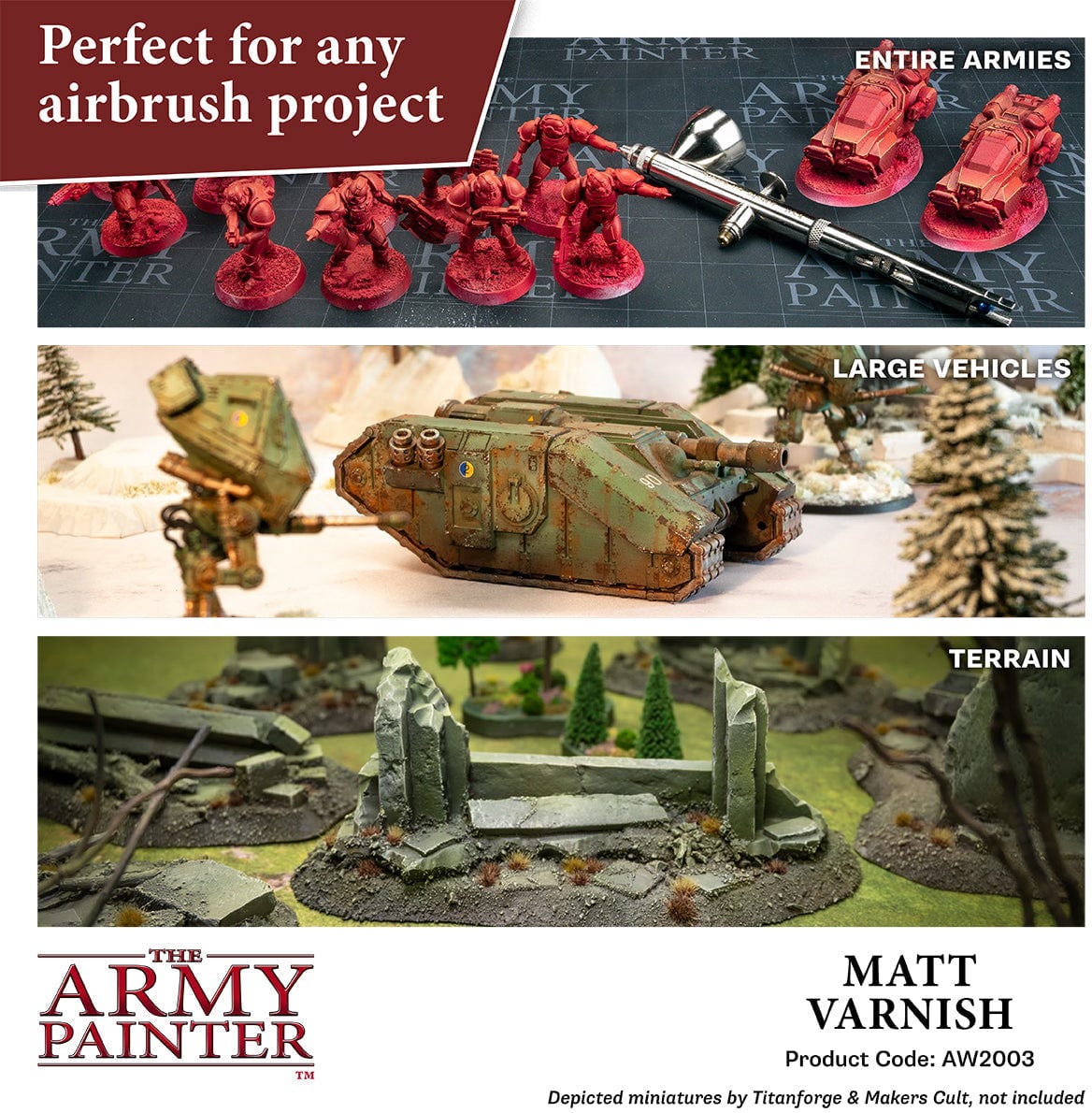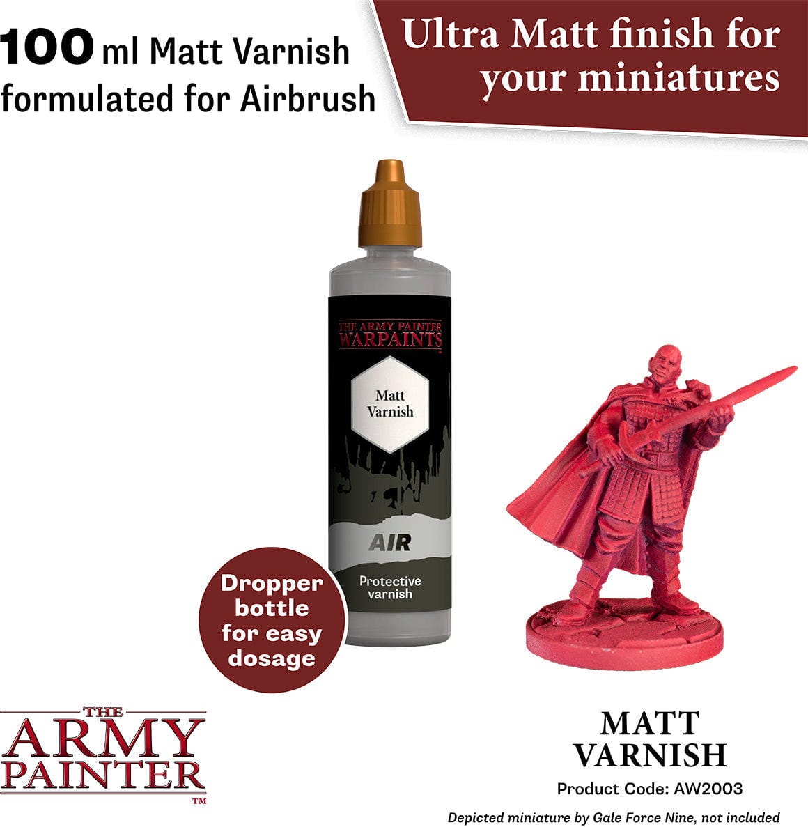 The Army Painter Warpaints Air Varnish é um verniz acrílico transparente de alta qualidade, à base de água, para aplicação com airbrush. Proporciona uma selagem uniforme e suave, protegendo as tuas miniaturas de forma fiável contra desgaste, riscos e lascas.